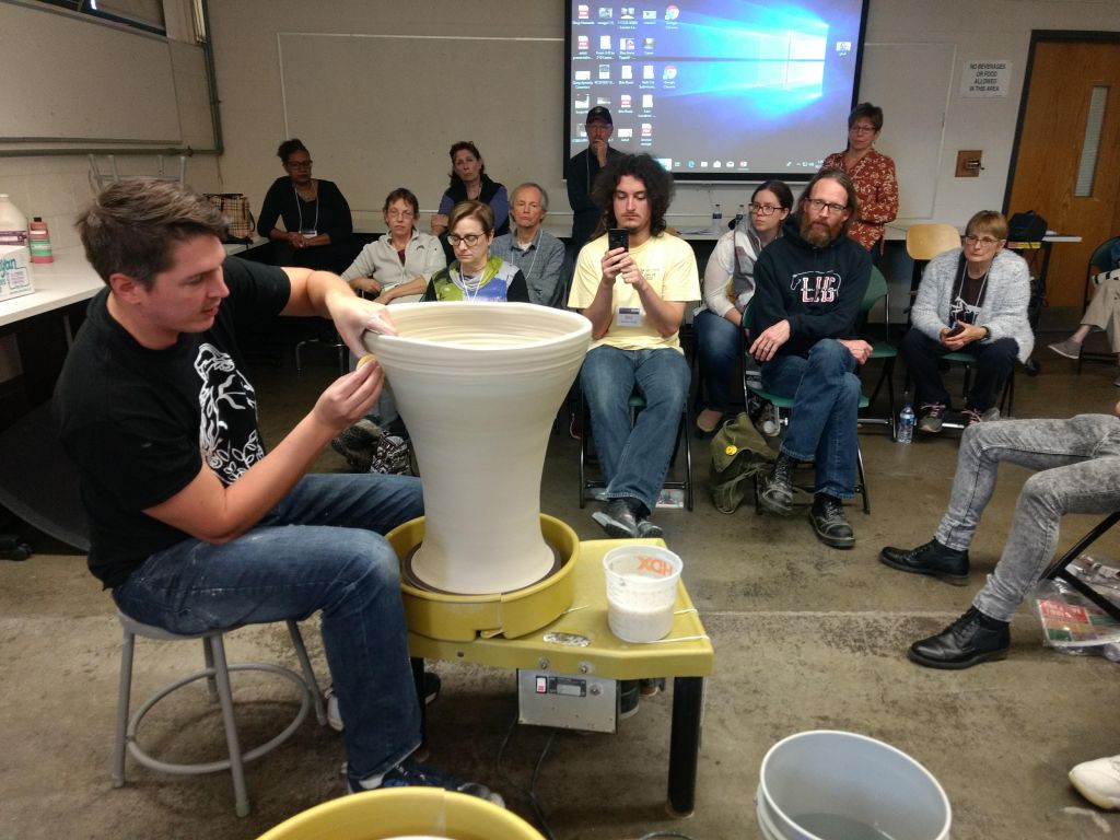 Lane Kaufmann Demonstrating Artist great flashing, side-fired, porcelain, beautiful drip on the lip of the bottle from ash, lined with a celedon Share this: Click to share on X (Opens in new window) X Click to share on Facebook (Opens in new window) Facebook Like Loading...