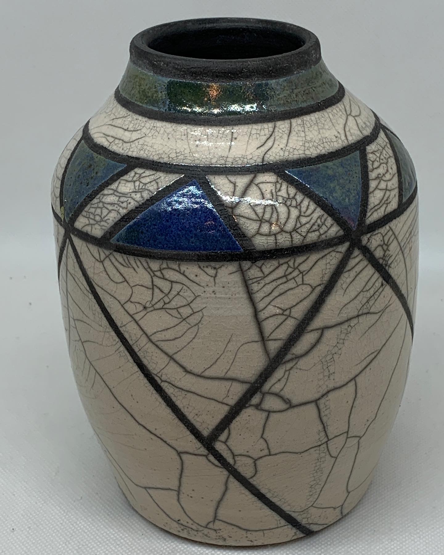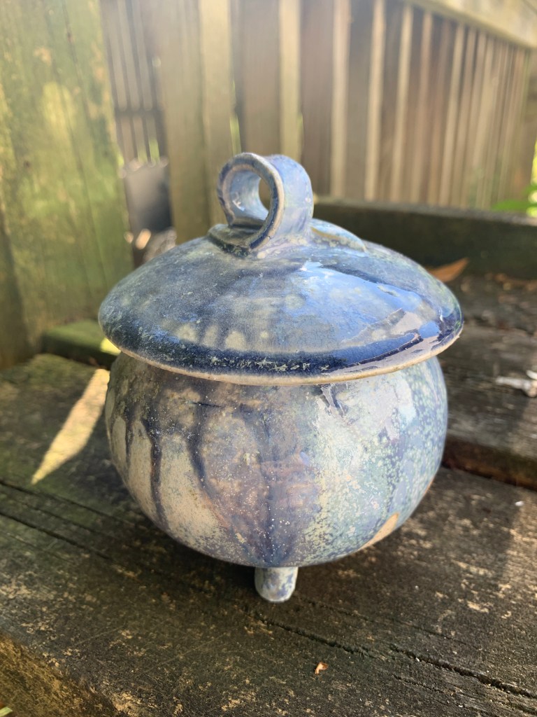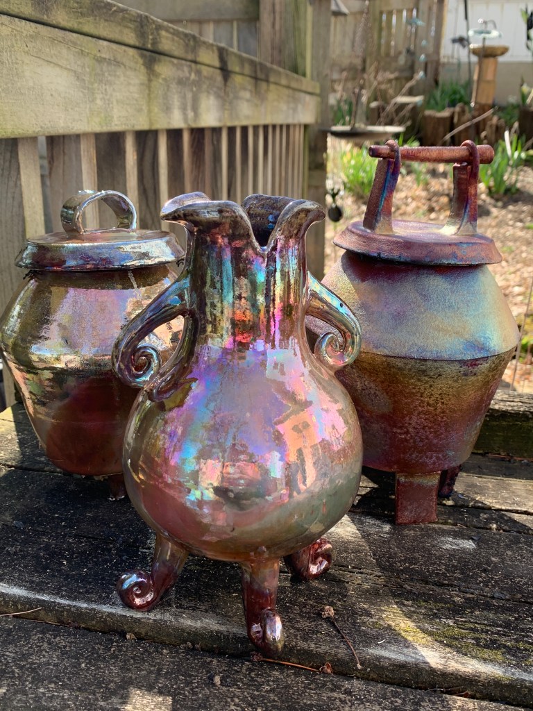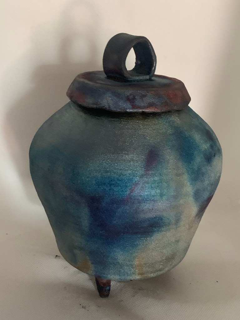Raku pottery firing is a serendipitous process using earth, water and fire. The surface design of these pieces is inspired by my Michigan Native American roots. The lines emphasize the natural rhythms of nature. The small accents of turquoise symbolize inner healing, clarity of thought and recharging of the spirit. The tripod feet represent balance, grounding and stability.