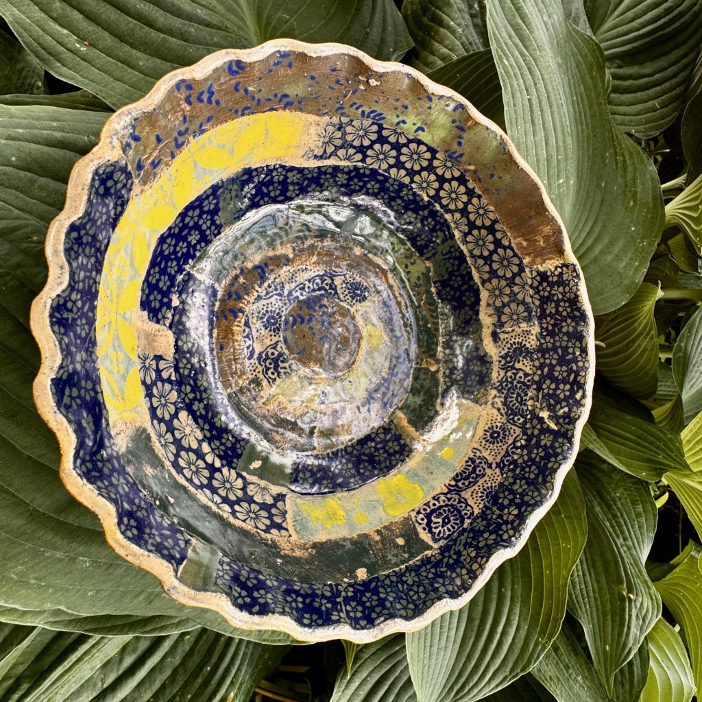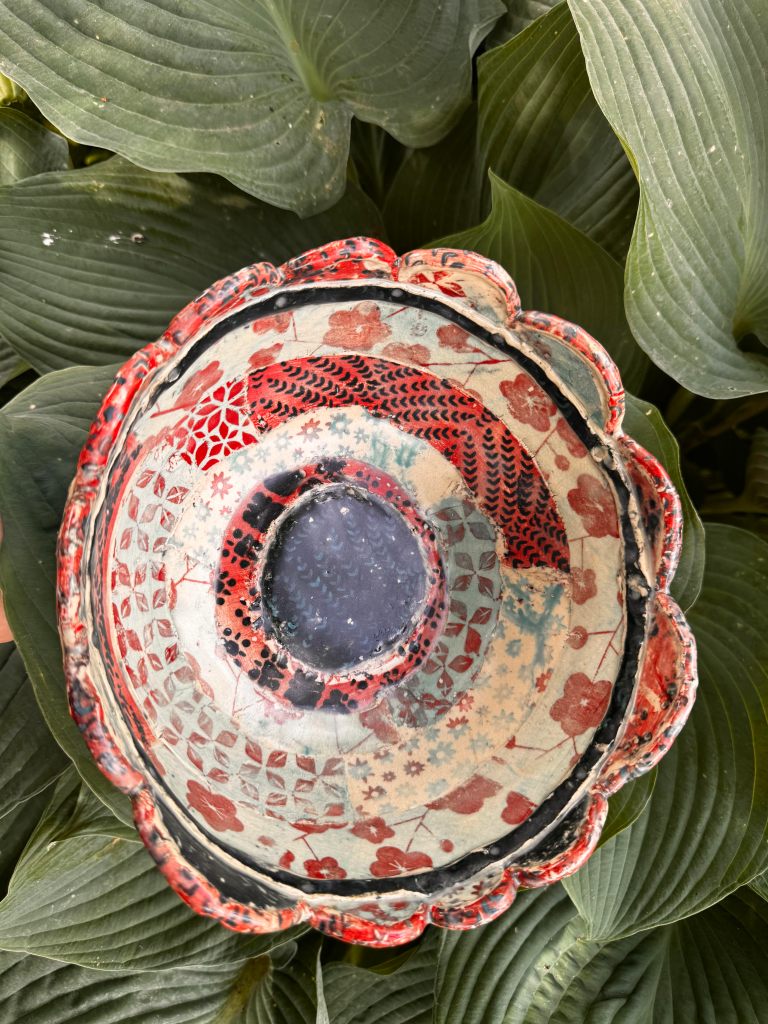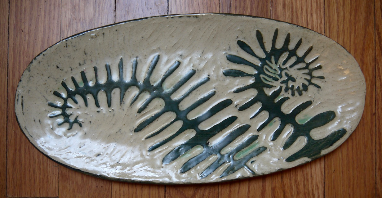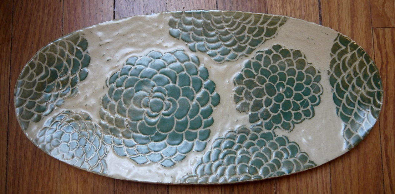 Functional hand built pottery is my creative release. As an engineer I am always thinking about how I could make a piece better or faster but then I sit in front of a piece of leather hard clay and all I want to do is carve. Using sgraffito techniques I carve in clay the same motifs I doodle in the margins of my engineering notes–petals and waves and clouds and leaves. When I make a piece, I think about how it will look as a serving piece. I like when food covers the design and invites you to guess what is behind that tomato or under that cookie.